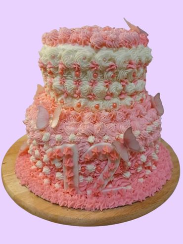 Elevate your celebration with our luxurious two-tier cake, handcrafted to reflect your unique taste and style. Each tier features 3 to 4 decadent layers of moist, flavorful cake, enveloped in our signature crusting buttercream—perfect for a polished finish and lasting freshness.