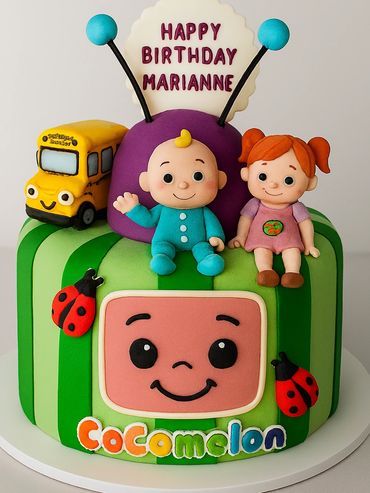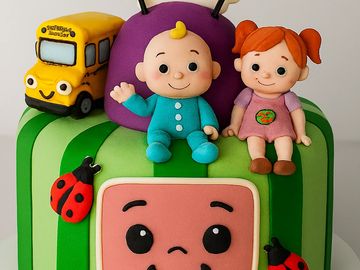 This cake has a children's theme but is a treat for everyone. This cake is made with fresh made buttercream, in your choice of flavors (vanilla or chocolate), sandwiched between four layers of fresh baked cake (vanilla, chocolate, butter), with the option to include a layer of cheesecake. The theme design is fashioned by hand from a decadent vanilla fondant. This cake is sure to be a party pleaser.