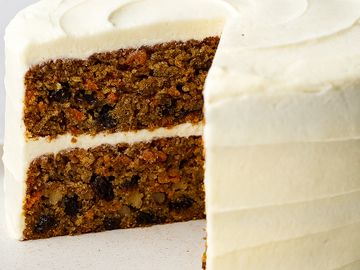 A moist, made-from-scratch cake, infused with vanilla extract, warm spices, and rich butter. Loaded with freshly grated carrots, plump raisins, and crunchy black walnuts. Finished with a thick layer of luscious homemade cream cheese frosting.