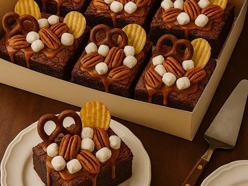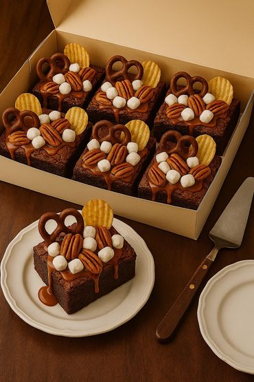 A bold reimagining of the classic chocolate brownie, this indulgent creation is baked in the traditional style to deliver the comforting warmth of vanilla and rich cocoa, with a perfect interplay of soft chew and subtle crunch. Each decadent square is lavishly topped with a cascade of small-batch butter caramel, then layered with chocolate-covered pretzels, pillowy marshmallows, pecans, and crispy potato chips. The result is a symphony of textures and flavors—sweet, salty, nutty, and decadent—cr