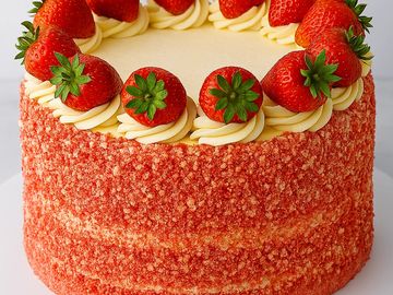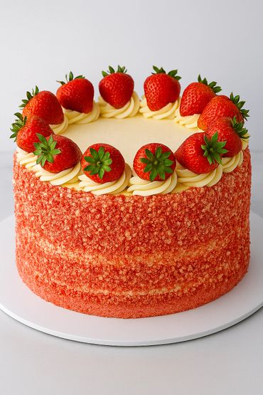 Take your dessert game to the next level with our Strawberry Cheesecake Crunch Cake—a perfect mix of creamy goodness and fruity charm. At its core is a classic cheesecake, layered between two soft, fluffy tiers of strawberry cake. Every bite is a delightful balance of tangy creaminess and sweet berry flavor. The whole cake is coated in a rich mix of vanilla and strawberry crumble. Made with top-quality ingredients, it’s the ultimate showpiece for any celebration—or a decadent treat for yourself.