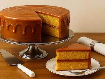 Our decadent caramel cake starts with a freshly baked base infused with the rich flavors of vanilla, butter, and caramel. It's then topped with a luscious glaze made from our small-batch, soft butter caramel.
