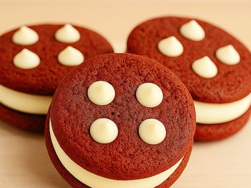 A decadent take on a classic treat. Our 5" red velvet sandwich cookie is made with rich cocoa, vanilla, and butter for a soft, tender texture. Between each cookie lies a thick layer of tangy cream cheese filling that perfectly balances the sweetness. Topped with premium white chocolate chips, this indulgence is both sophisticated and utterly irresistible.