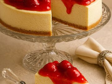 A timeless indulgence, elevated. Our vanilla cheesecake is crafted with silky cream cheese, vanilla, and a buttery graham cracker crust for a rich, velvety texture and balanced sweetness. Crowned with a vibrant strawberry topping made from ripe, hand-selected berries, each slice delivers a burst of bright fruit flavor that perfectly complements the creamy base. Elegant, luscious, and unforgettable—this is cheesecake at its finest.