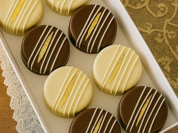 This delicious treat combines the deliciousness of chocolate and Oreo cookies. Each cookie is coated in either white or milk chocolate and decorated with assorted designs. Around 5.5 ounces per cookie. Available in vanilla and mint Oreos. Other Oreo flavors available as a custom order at additional cost.