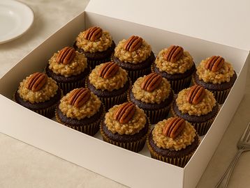 Experience the luxurious allure of our German Chocolate Cupcakes, a gourmet interpretation of the beloved classic. Each rich, cocoa-infused cupcake is crafted with premium chocolate and milk for a tender crumb and deep, velvety flavor. At the heart of this indulgence lies our signature coconut-pecan topping—slow-cooked to perfection with pecans, tender shredded coconut, and a buttery caramel glaze.
