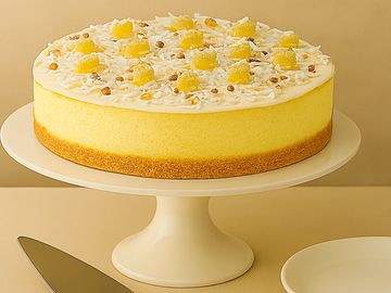 Our Pina Colada Cheesecake is a tropical treat, combining the bold flavors of pineapple, coconut, and a touch of rum in a creamy, smooth cheesecake. Each slice is topped with a rich white chocolate ganache, toasted coconut, black walnuts, and candied pineapple. This dessert brings a taste of the islands to every bite, offering the perfect mix of creamy indulgence and exotic charm—ideal for adding a bit of paradise to any occasion.
