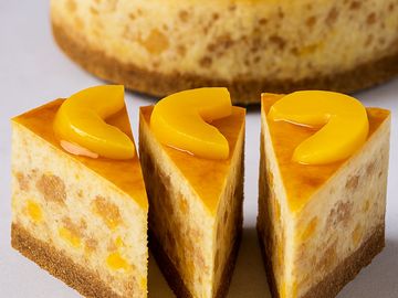 Where Southern charm meets creamy indulgence — our Peach Cobbler Cheesecake is a towering 3-inch slice of heaven that captures the soul of two beloved desserts in one unforgettable bite. Baked into a golden high-back graham cracker crust, this rich cheesecake is swirled with warm spices, juicy peaches, and tender pieces of flaky pie crust, echoing the heart of a classic cobbler. It’s then crowned with a luscious peach sauce and more ripe peach slices for a vibrant, sun-kissed finish.