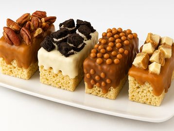 These indulgent treats start with freshly made rice squares, coated in rich milk chocolate or our small-batch buttery caramel, then rolled in a variety of toppings. Each handcrafted treat weighs between 8 to 12 ounces, depending on the topping.